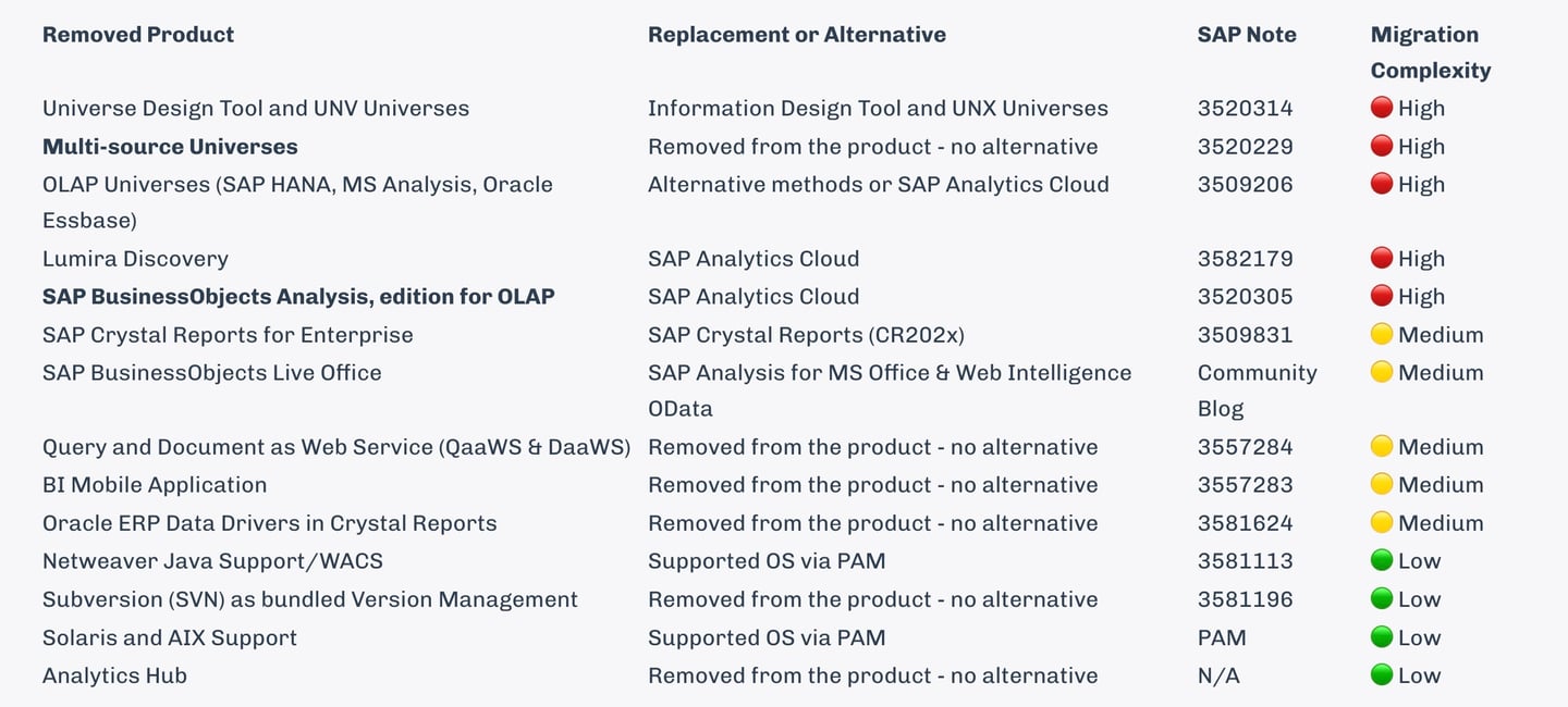Here’s a comprehensive summary of the products and features SAP is removing in BI 2025, along with replacements, migration complexity, and direct links to SAP Notes for in-depth reference: